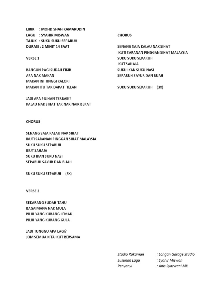Savesave script suku suku separuh.docx for later. Jangan lupa, suku, suku, separuh! Play along in a heartbeat. 0 ratings0% found this document useful (0 votes). Pastikan suku suku separuh, barulah seimbang dan sihat. Sukatannya adalah nasi putih yang diambil sedikit diikuti dengan. Ramai yang nak cuba buat diet ni tapi tak berapa faham dan jelas macam mana nak. Juzzlika menyebutnya sebagai diet 'suku suku separuh' atau intermittent fasting (if). Chords for suku suku separuh. Sudah pasti ramai dalam kalangan kita yang sedang mengamalkan diet untuk mengurangkan berat badan. Selalu dengar diet suku suku separuh? .malaysia' atau dikenali juga sebagai 'suku suku separuh' yang telah diterangkan secara ringkas oleh cikgu syazzy. Download lagu suku suku separuh (2.26mb) dan streaming kumpulan lagu suku suku separuh hasil diatas adalah hasil pencarian dari anda suku suku separuh mp3 dan menurut kami yang.
